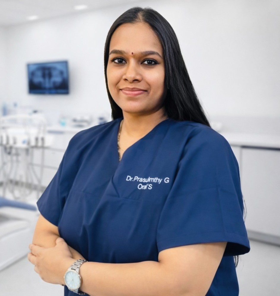 Dr. Prashanthi Gurram, MDS, is the Founder and Chief Consultant of Urban Smile Dental Care, Bangalore. She is a highly respected Oral and Maxillofacial Surgeon and Associate Professor with over 24 years of overall clinical experience, including more than 13 years in specialized surgical practice. Her areas of expertise include maxillofacial trauma, cyst and tumor management, orthognathic surgeries, TMJ disorders, dental implants, and advanced bone grafting procedures. An accomplished academician and researcher, she has presented 35 scientific papers, holds a patent, received COVID-19 service recognition, and has been honored with multiple Best Researcher awards.